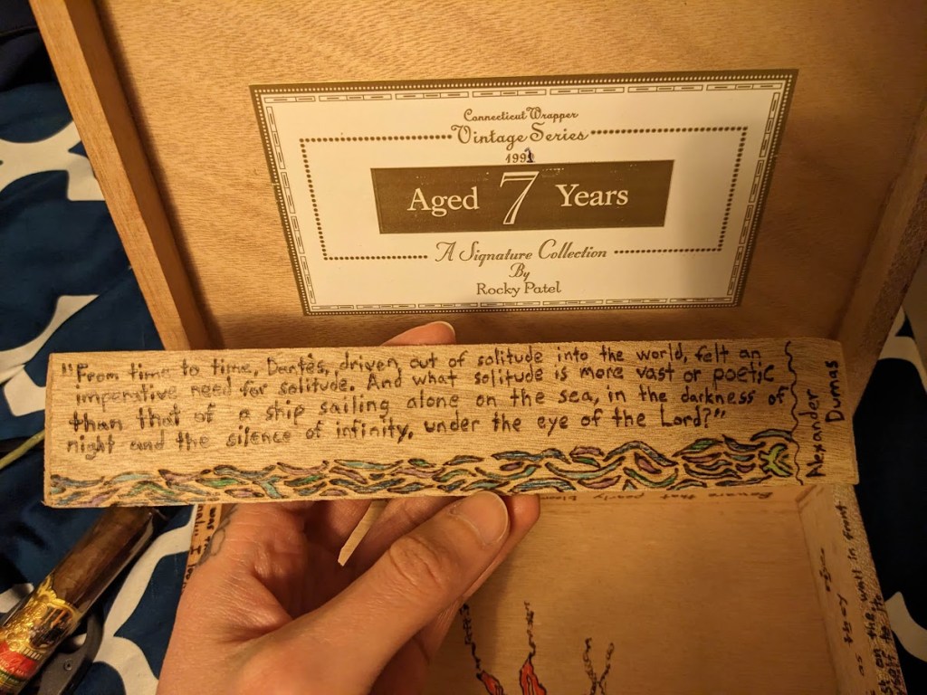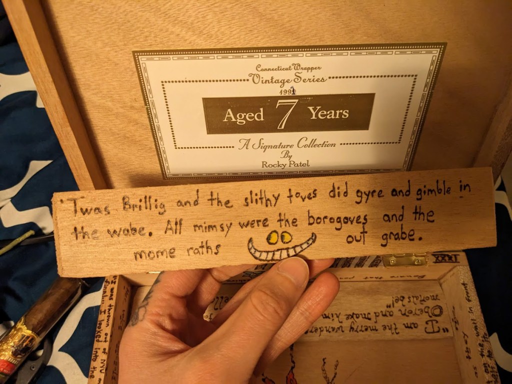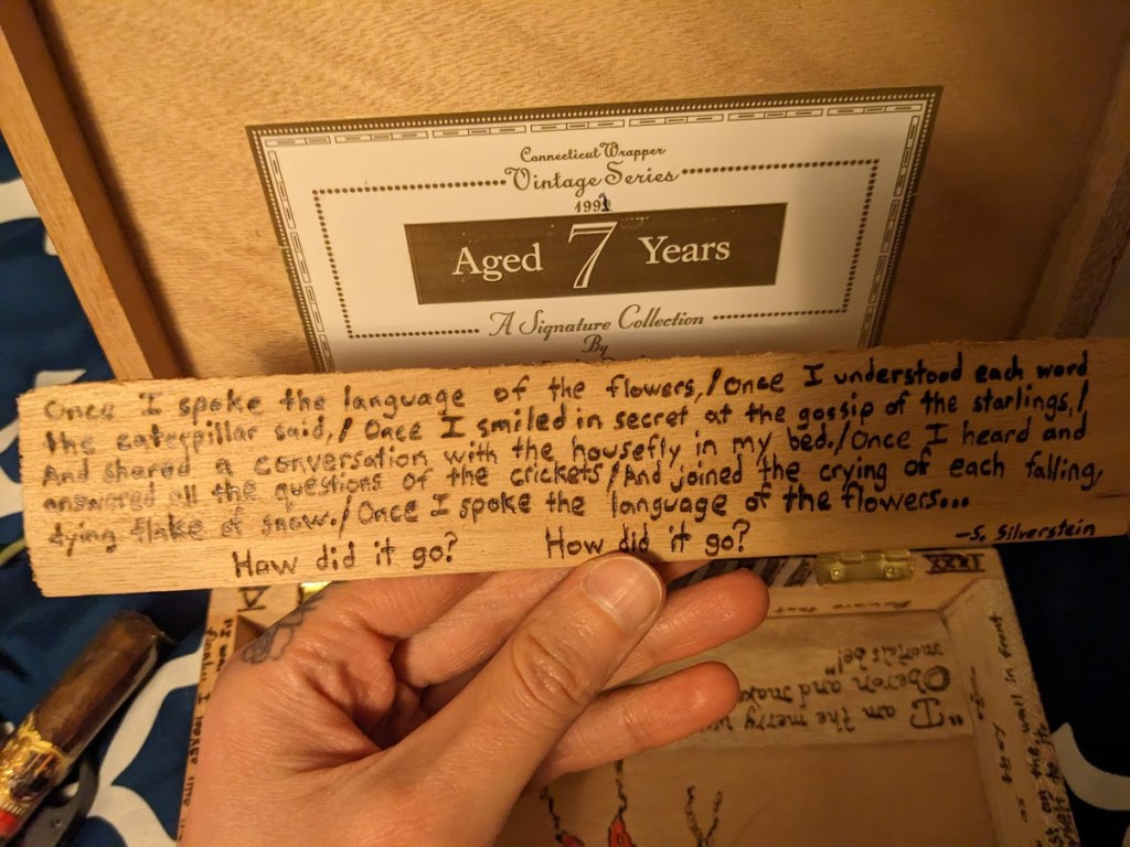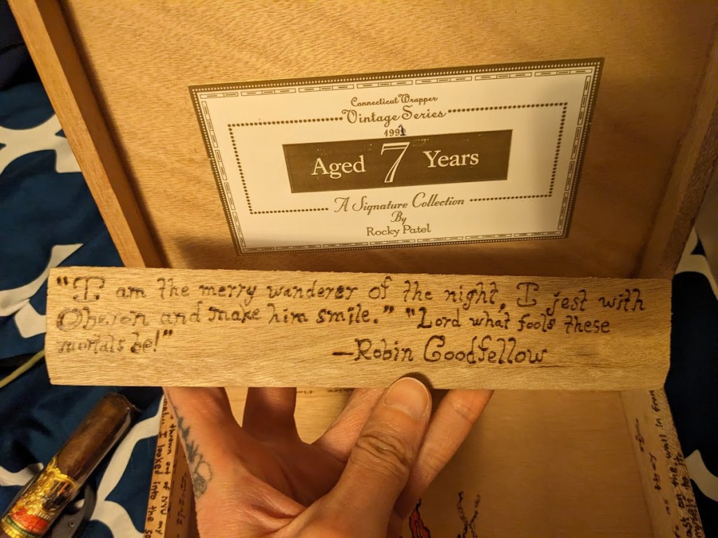 Favorite insets from the first cigar box given as a gift to a friend, as a Christmas present. The Silverstein poem was a nice find about the fading world of childhood imagination, especially since I was going with an “Alice” motif here (along with the Cheshire Cat, there’s the Jefferson Airplane song on another inset). The fact there was a caterpillar in there made it fit right in. The Robin Goodfellow quote is Puck from A Midsummer Night’s Dream, another trickster like the Cheshire Cat.