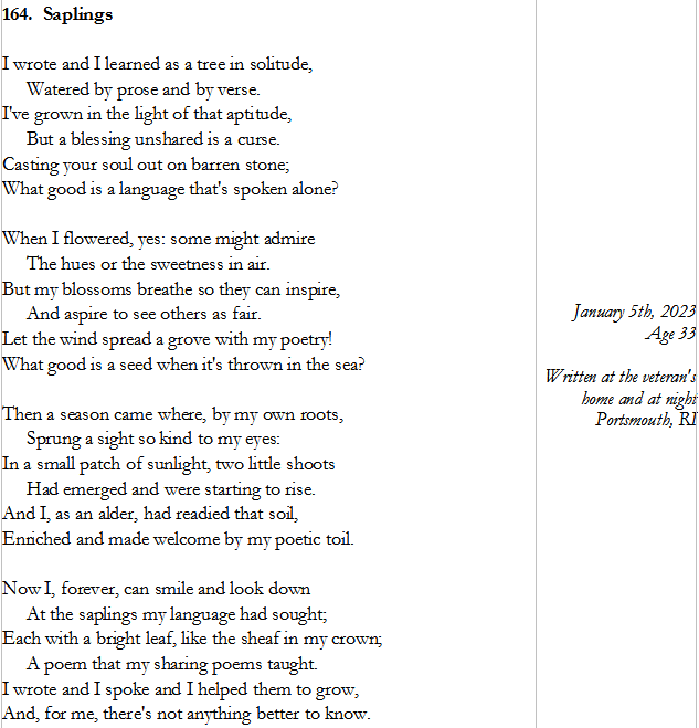 Lines 7 & 8: A little bit of melancholy about the experience of head-patting I’d get in younger years for writing poetry. It was nice to be complimented, don’t get me wrong. But having people be engaged is definitely preferable.