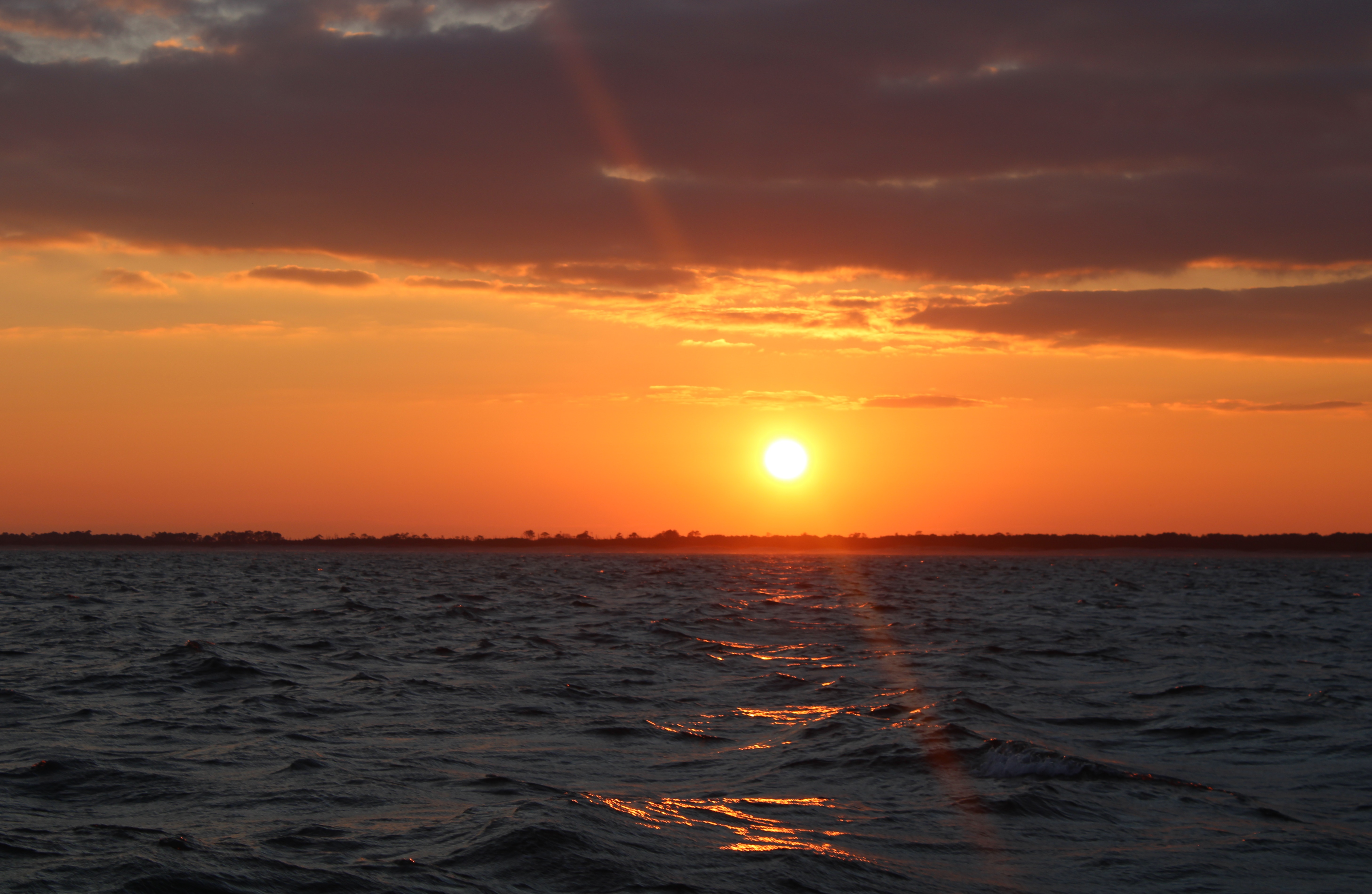 February 6th, 4:00 PM ... and then the clouds over a shoreline silhouetted with trees against a golden horizon, struck through with lances of sunbeams, show that nature is indeed still capable of reaching me with its beauty. There was a new observation for me on the nuance of hue across waves. The other day, I enjoyed being able to look port and starboard to see two different reflections, under clear blue stretching out versus dark grey under clouds. But around 3 PM, the exact line of those two scenes in motion traversed our wake, so that, looking astern, stretching back as far as I could see, the upslope of waves on one side rose in swells of slate that dappled at their crest in pits and pulses with an azure that overtook it to run down the other.