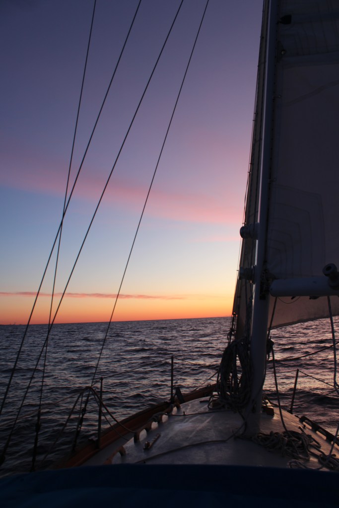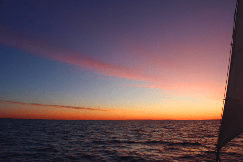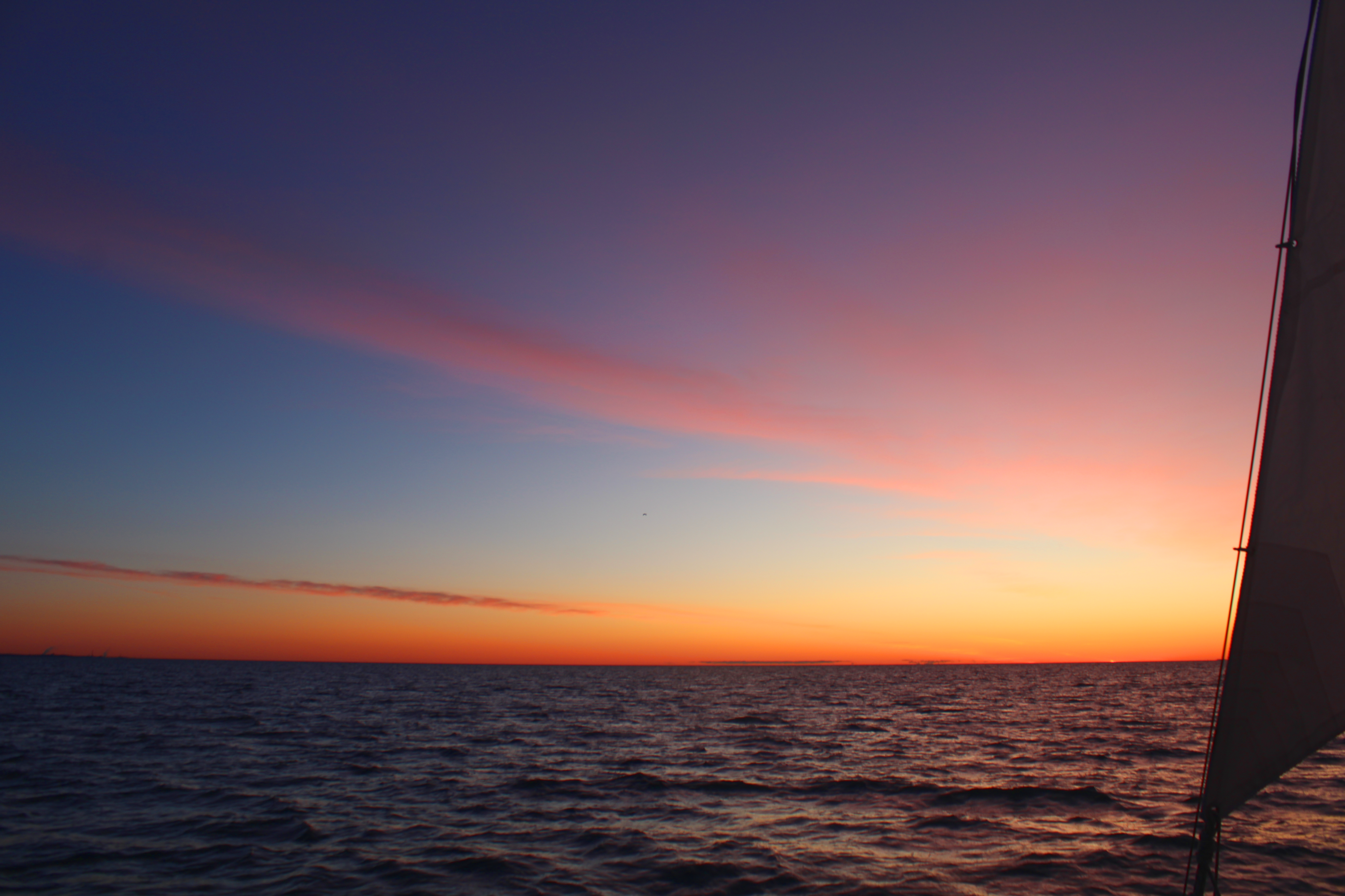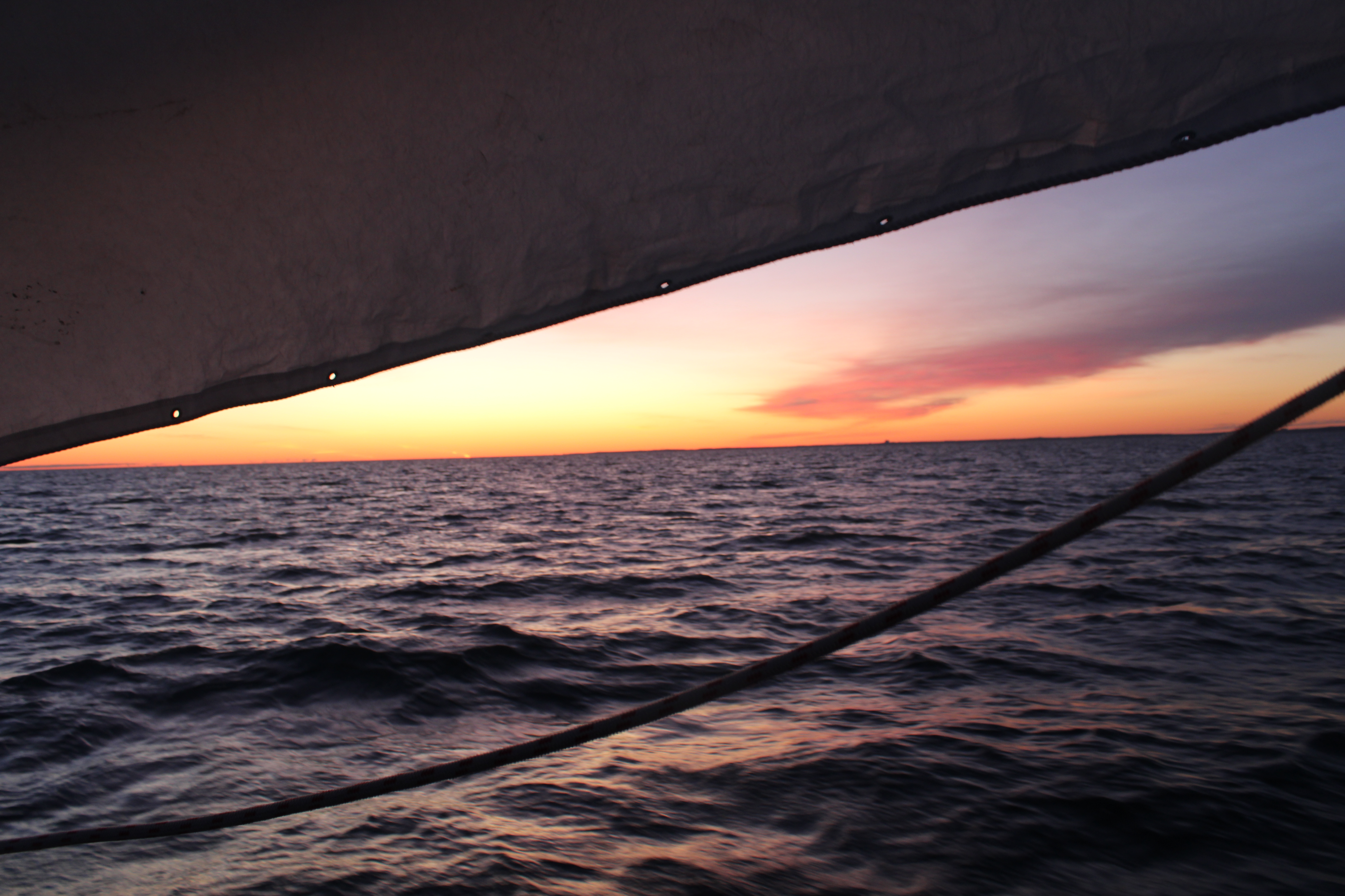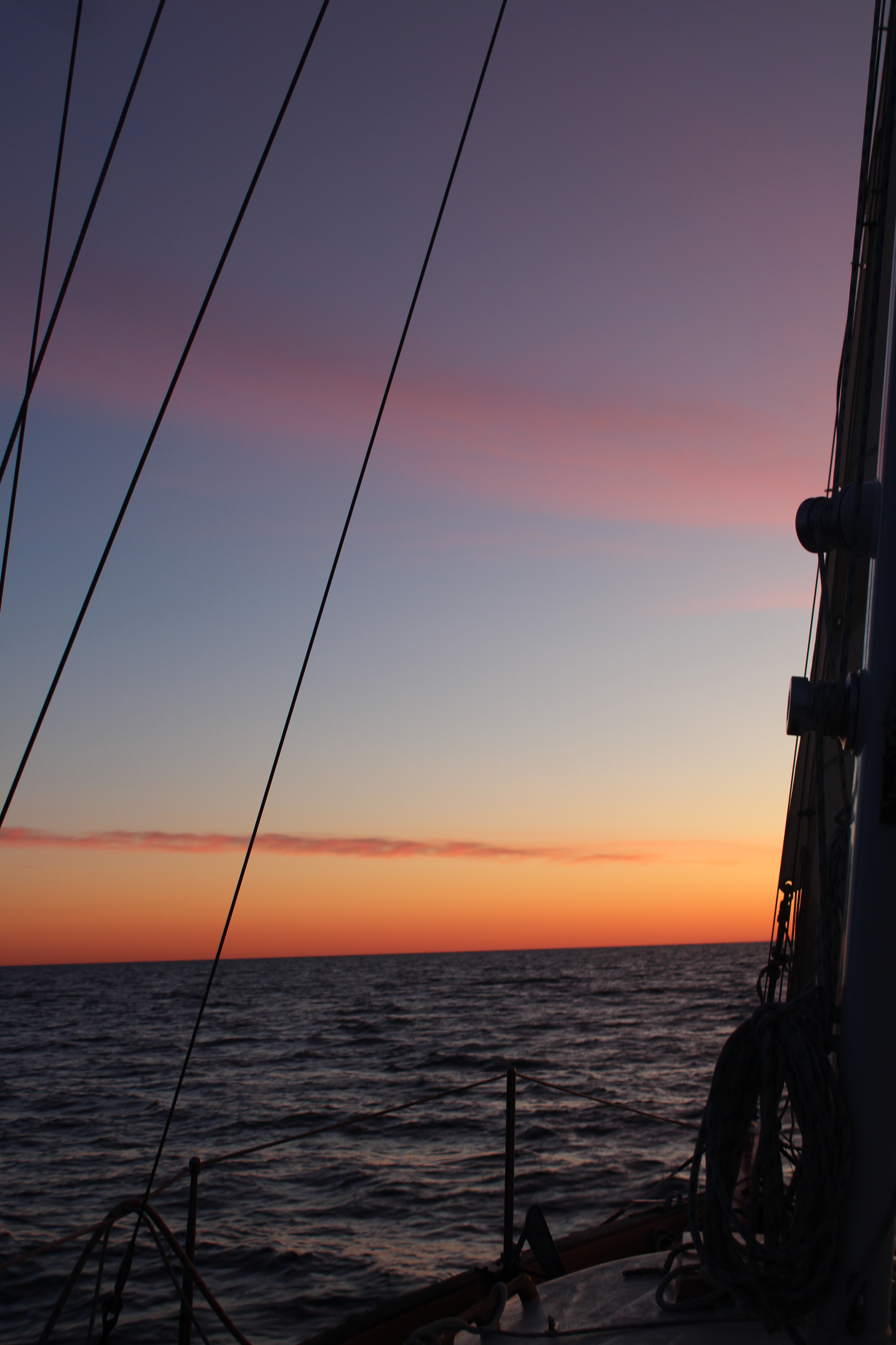 Well, we got going again and spirits eventually improved over the course of the day, which was basically non-stop motoring. So we got to hear that engine at an incredibly safe decibel level for human hearing for the entire time. The sunrise was one of the best of the trip, though.