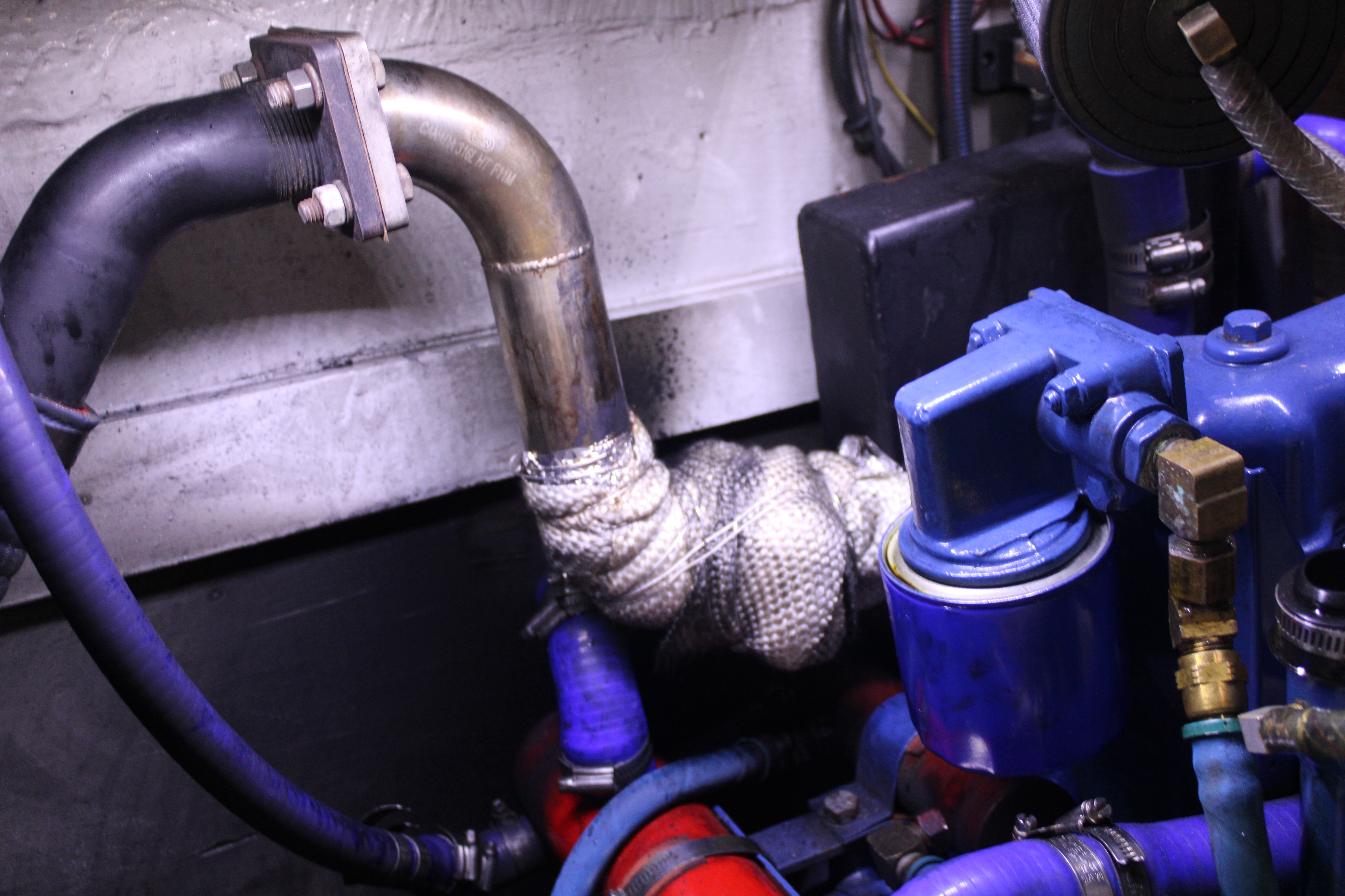 Tripp had me find the aluminum foil in the v-berth storage, then he put the entire roll around the crack, fastened it down the hose clamps, and then put fiberglass exhaust wrap and locking wire around that.